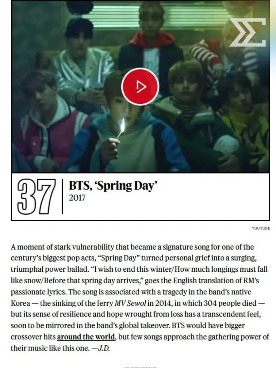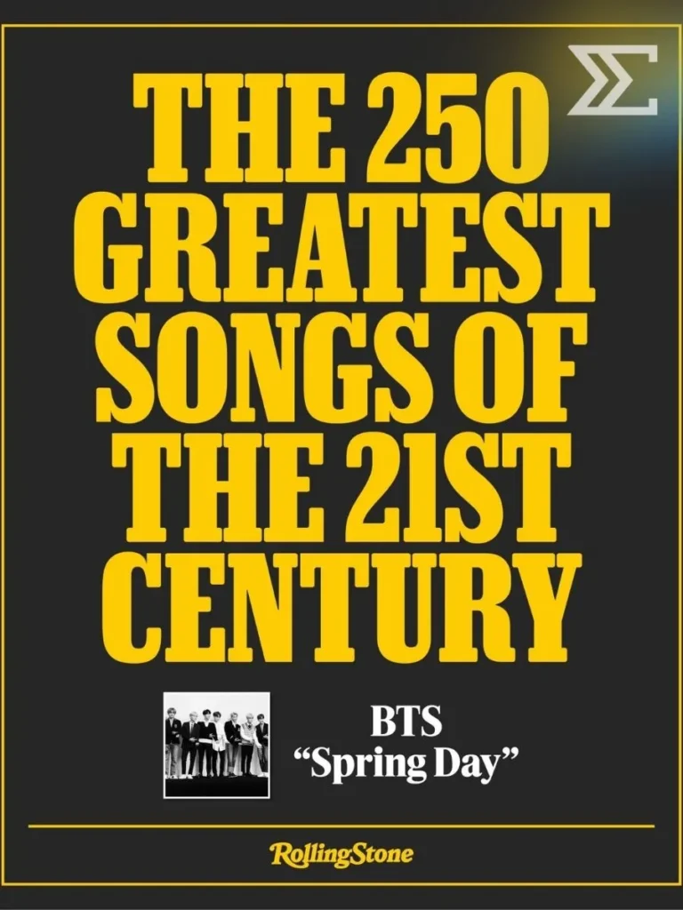 นิตยสารดนตรีระดับโลก Rolling Stone ได้ประกาศ “250 เพลงที่ยิ่งใหญ่ที่สุดในศตวรรษที่ 21” (The 250 Greatest Songs of the 21st Century So Far) โดยหนึ่งในเพลงที่ถูกพูดถึงมากที่สุดในครั้งนี้คือ “Spring Day” ของ BTS ซึ่งคว้าอันดับที่ 37 ไปครอง ถือเป็นอันดับสูงสุดของเพลง K-Pop ในลิสต์นี้