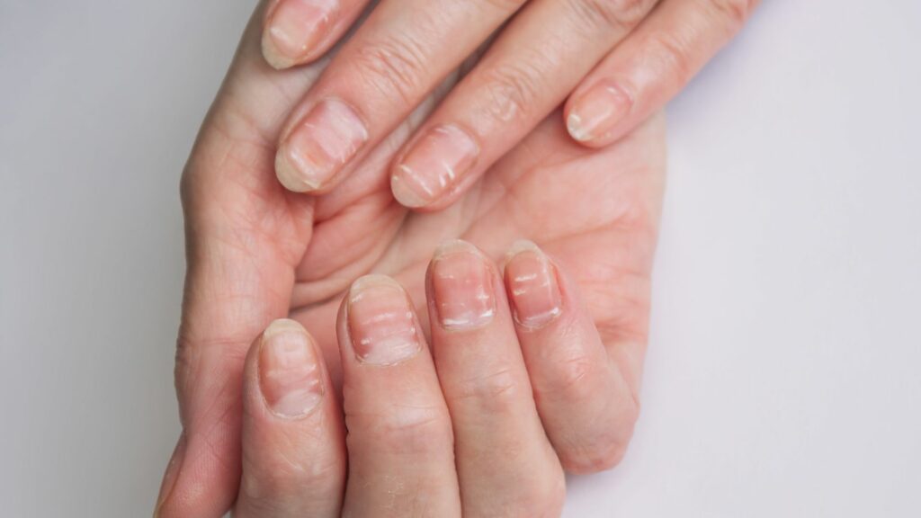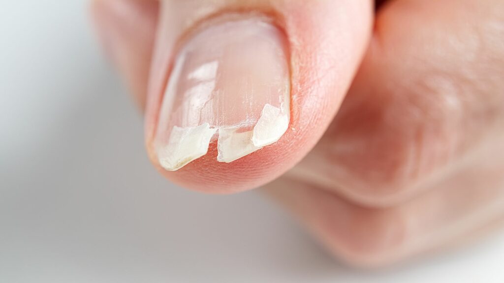 1. เล็บบางแตกหักง่าย หรือฉีกบ่อย เล็บบางกว่าปกติมักเกี่ยวข้องกับภาวะโลหิตจาง โดยเฉพาะภาวะโลหิตจางจากการขาดธาตุเหล็ก รวมถึงการขาดสารอาหาร ขาดไบโอติน (Biotin), โปรตีน, และแร่ธาตุ เช่น สังกะสี (Zinc)