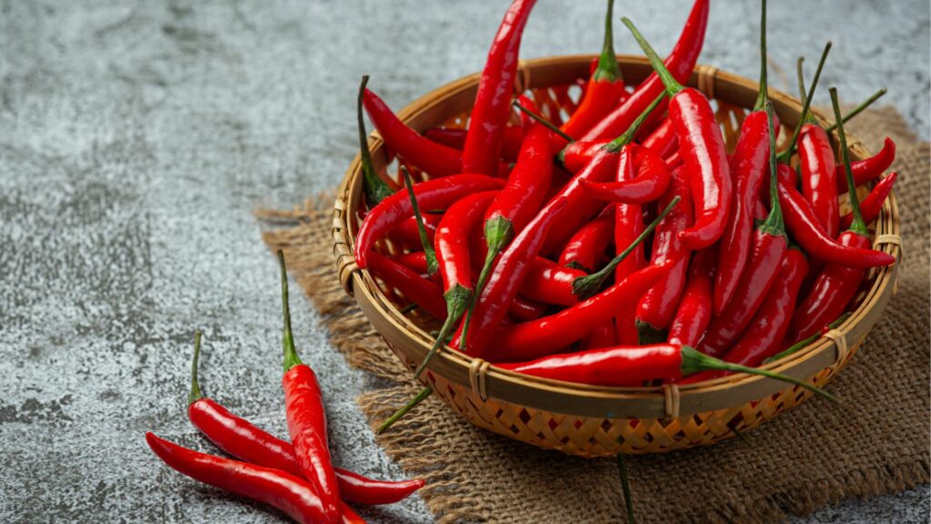 3. พริก สารแคปไซซินในพริกช่วยเพิ่มอุณหภูมิร่างกายให้สูงขึ้นและกระตุ้นการเผาผลาญ งานวิจัยจากมหาวิทยาลัยเพอร์ดู (Purdue University) ในสหรัฐฯ พบว่า การกินพริกในปริมาณเหมาะสมช่วยลดความอยากอาหาร และทำให้บริโภคอาหารที่มีไขมันสูงหรือน้ำตาลสูงน้อยลง
