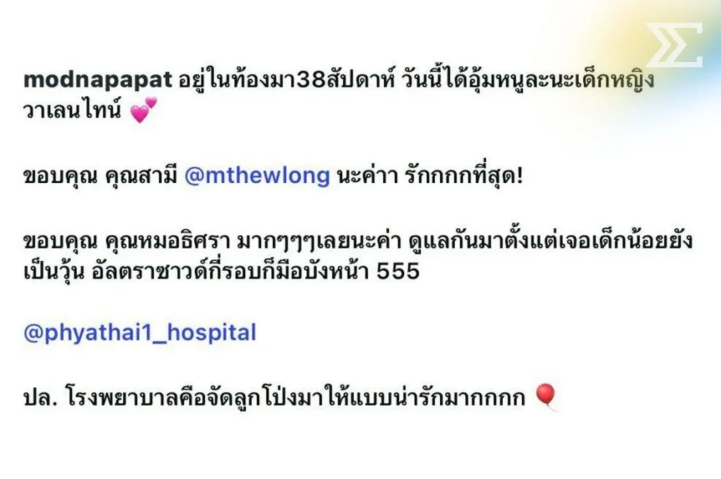 “อยู่ในท้องมา 38 สัปดาห์ วันนี้ได้อุ้มหนูละนะ เด็กหญิงวาเลนไทน์! ขอบคุณคุณสามี @mthewlong นะค่าา รักที่สุด! ขอบคุณคุณหมอธิศรา ดูแลกันมาตั้งแต่เจอเด็กน้อยยังเป็นวุ้น อัลตราซาวด์กี่รอบก็มือบังหน้า 555”