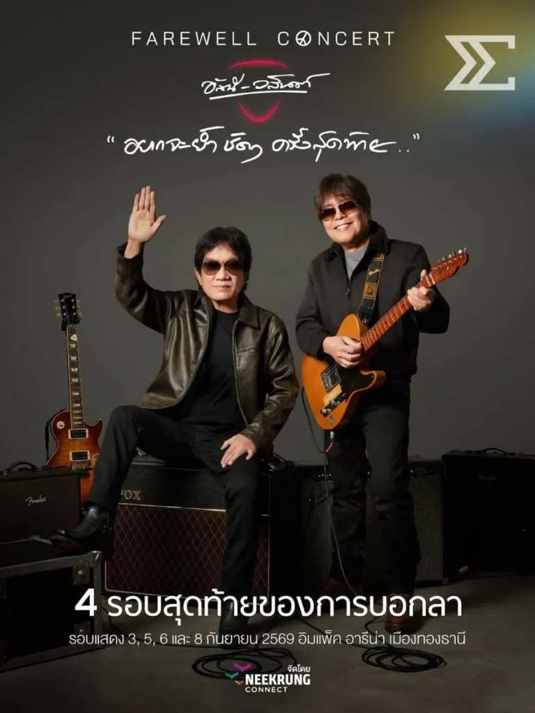 ถือเป็นอีกหนึ่งหน้าประวัติศาสตร์ของวงการเพลงไทย เมื่อสองตำนานร็อกอย่าง อัสนี – วสันต์ ประกาศจัดคอนเสิร์ตอำลาในชื่อ “FAREWELL CONCERT อยากจะย้ำชัดๆ ครั้งสุดท้าย” เพื่อปิดฉากเส้นทางดนตรีตลอดกว่า 40 ปีอย่างสมบูรณ์
