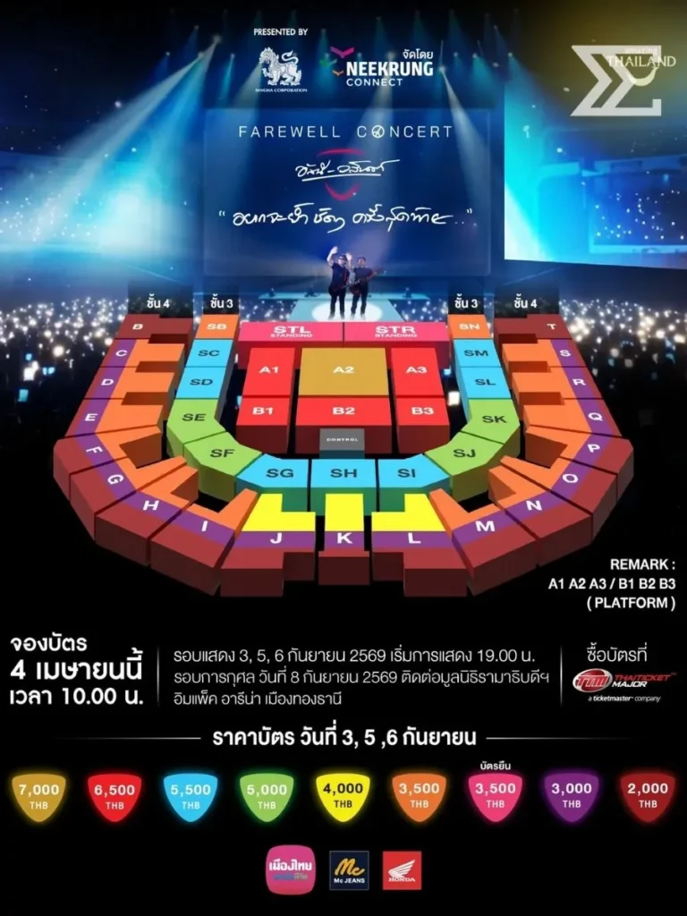 ราคาบัตร: 2,000 / 3,000 / 3,500 / 3,500 (บัตรยืน) / 4,000 / 5,000 / 5,500 / 6,500 / 7,000 บาท