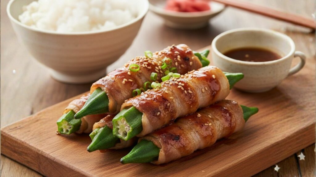 2. กระเจี๊ยบเขียวพันหมูสไลด์ย่างซอสญี่ปุ่น
