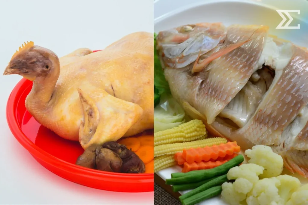 - ไก่ต้ม 1 ตัว หรือครึ่งตัว ความหมาย: ความขยัน ซื่อสัตย์ ความก้าวหน้าในชีวิตและการงาน