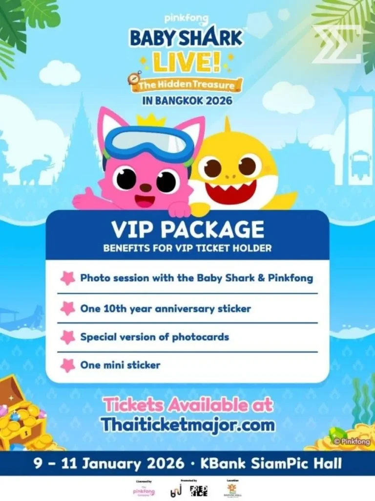 สำหรับการจำหน่ายบัตรสามารถซื้อบัตรออนไลน์ได้ที่ https://www.thaiticketmajor.com/performance/baby-shark-live-the-hidden-treasure-in-bangkok-2026.html