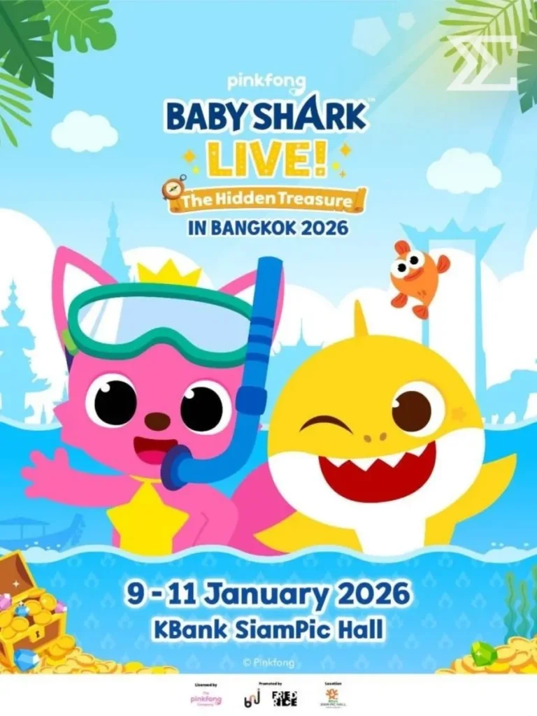 โชว์มิวสิคัลสุดยิ่งใหญ่ BABY SHARK LIVE <The Hidden Treasure> in BANGKOK 2026 จะจัดขึ้นระหว่าง วันที่ 9–11 มกราคม 2569 ที่ เคแบงก์สยามพิฆฮอลล์ กรุงเทพฯ โดยงานนี้ไม่ได้เป็นแค่การแสดงธรรมดา แต่เป็น “การเดินทางผจญภัยใต้ทะเล” ที่เต็มไปด้วยสีสันของเพลงฮิต การเต้นตามจังหวะ และเรื่องราวสนุก ๆ ที่เด็ก ๆ ร่วมร้องและเต้นตามได้ทั้งเรื่อง