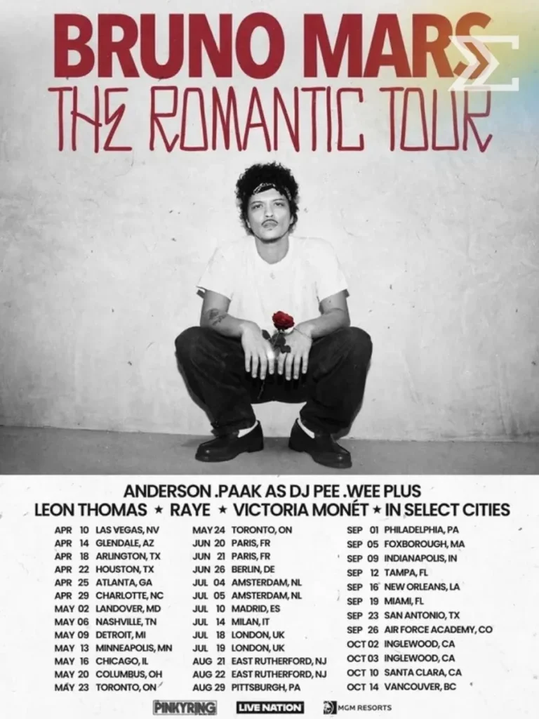 แฟน ๆ ที่รอคอยการกลับมาของ Bruno Mars คงจะได้สัมผัสทั้งเพลงใหม่และโชว์สดสุดอลังในปีนี้ ก่อนจะเข้าสู่ช่วงการเดินทางดนตรีครั้งยิ่งใหญ่บนเวทีระดับโลก The Romantic Tour ที่พร้อมจะพาเสียงเพลงหวานลอยไปทั่วทั้งยุโรปและอเมริกาเหนือภายในปี 2569 นี้