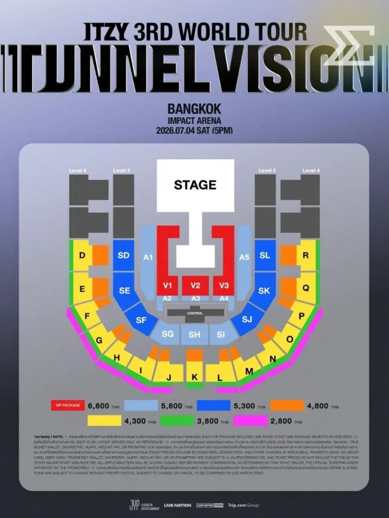 โดยคอนเสิร์ต ITZY 3RD WORLD TOUR <TUNNEL VISION> in BANGKOK จะจัดขึ้นในวันที่ 4 กรกฎาคม 2569 ที่ Impact Arena เมืองทองธานี เวลา 17.00 น. เวิลด์ทัวร์ครั้งนี้จัดขึ้นเพื่อโปรโมตผลงานใหม่ของวง พร้อมโชว์พลังการแสดงที่เป็นเอกลักษณ์ของสมาชิกทั้ง 5 คน ได้แก่ Yeji, Lia, Ryujin, Chaeryeong และ Yuna ซึ่งขึ้นชื่อเรื่องสเตจที่เต็มไปด้วยเอเนอร์จี้การเต้นที่แข็งแรง และคาริสม่าที่ทำให้เวทีลุกเป็นไฟ