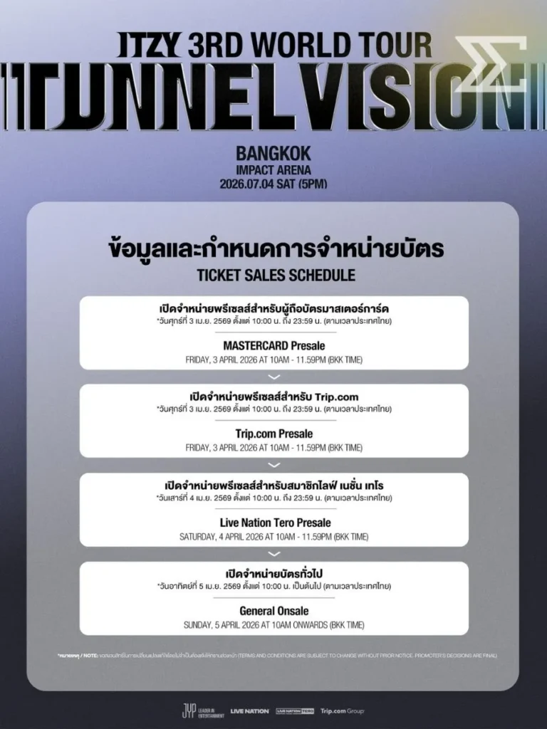 การกลับมาของ ITZY 3RD WORLD TOUR <TUNNEL VISION> in BANGKOK ในปี 2026 นี้ ถือเป็นอีกหนึ่งคอนเสิร์ตที่แฟนไทยตั้งตารอ ใครที่เป็น MIDZY ตัวจริง เตรียมวอร์มนิ้วรอให้พร้อม เพราะศึกกดบัตรคครั้งนี้รับรองว่าเดือดแน่นอน