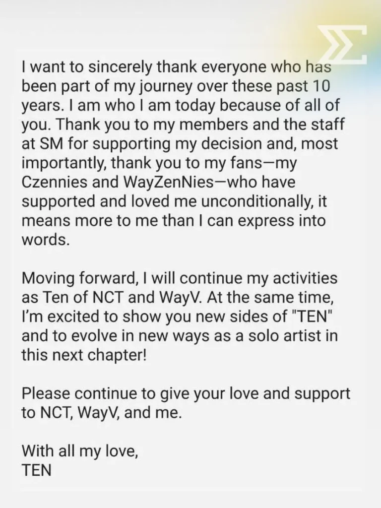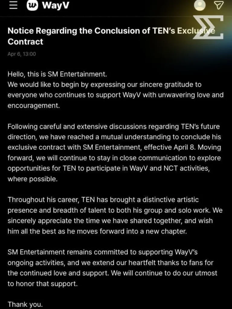 กลายเป็นอีกหนึ่งข่าวใหญ่ของวงการ K-POP ที่สร้างแรงสั่นสะเทือนให้แฟนคลับทั่วโลก เมื่อ TEN หรือ “เตนล์ – ชิตพล ลี้ชัยพรกุล” ศิลปินสัญชาติไทยสมาชิก NCT และ WayV ประกาศสิ้นสุดสัญญาพิเศษกับต้นสังกัด SM Entertainment อย่างเป็นทางการ หลังร่วมงานยาวนานกว่า 10 ปี