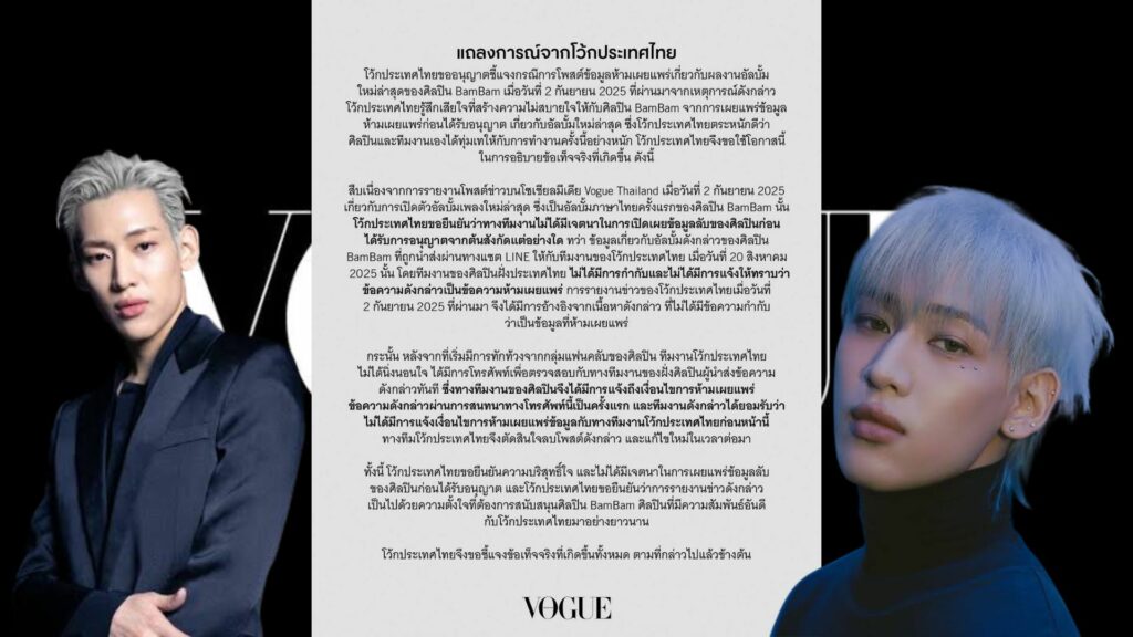 05 Sep, 2025ทำเอาวงการติ่งสะเทือน เมื่อ Vogue Thailand ถูกชาวเน็ตจับได้ว่ามีการปล่อยข้อมูลที่คล้ายกับการ “สปอยล์” อัลบั้มใหม่ของหนุ่ม แบมแบม GOT7 ออกมาก่อนเวลา จนกลายเป็นดราม่าร้อนบนโลกออนไลน์แบบไฟลุกทันที! เหตุการณ์เกิดขึ้นเมื่อมีโพสต์จากฝั่ง Vogue ออกมาเกี่ยวกับงานโปรเจกต์ของ แบมแบม แต่ดันมีข้อมูลบางส่วนที่ยังไม่ได้เปิดตัวอย่างเป็นทางการ หลุดออกมาให้แฟนๆ ได้เห็นก่อน หลายคนเลยแอบใจหายใจคว่ำ กลัวว่าจะเป็นการทำให้เซอร์ไพรส์ที่ศิลปินตั้งใจเตรียมไว้พังลงซะก่อน…